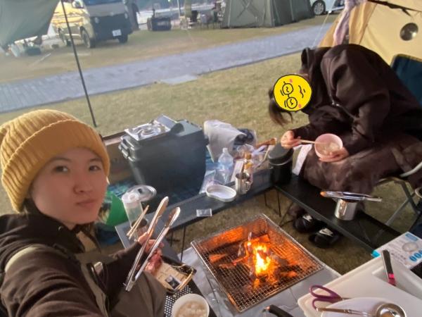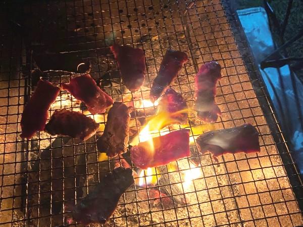 焚き火の明かりを頼りに肉を置いたところ、焼き色の判別がつかないほどの環境になってしまいました笑