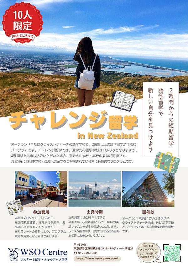 『ニュージーランド チャレンジ留学』~2026年4月下旬出発~